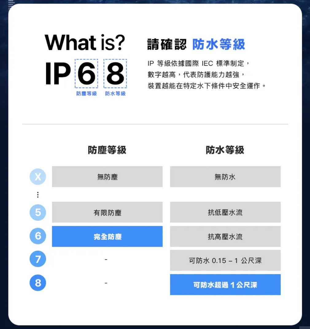 • IP68 防水等級 經嚴格測試可於 15 公尺水深中使用達 30 分鐘