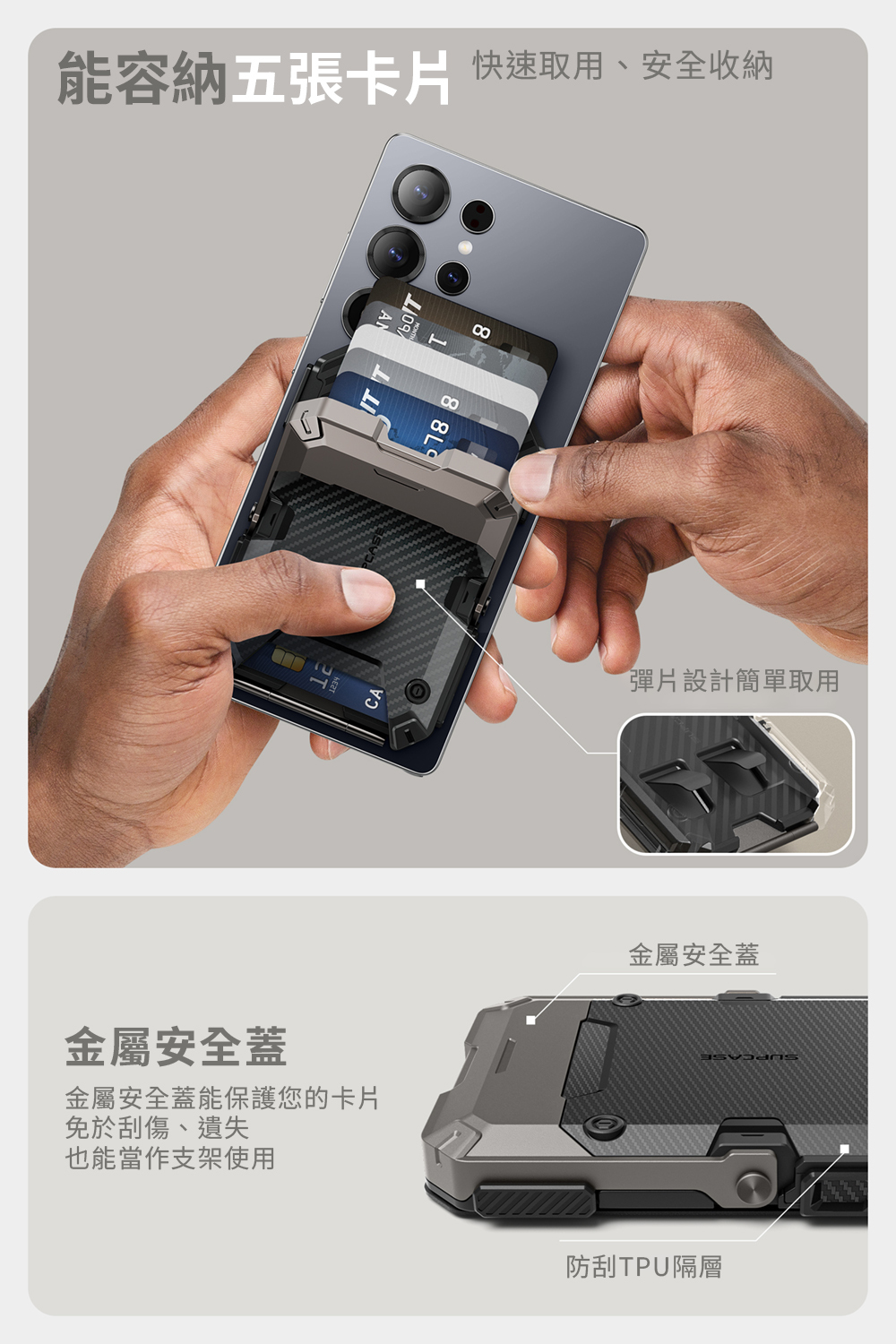 ●內建金屬鎖蓋可牢固固定卡片