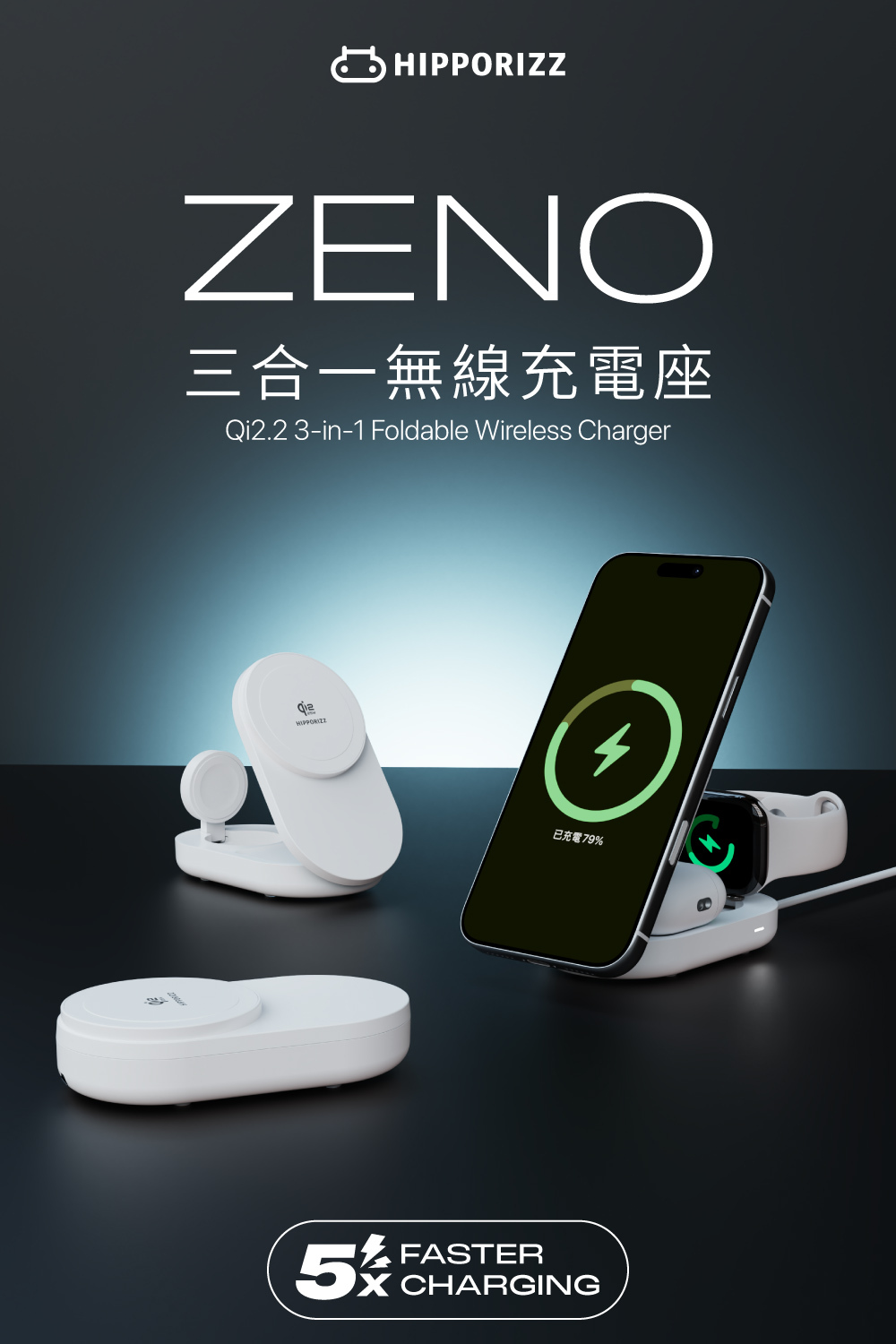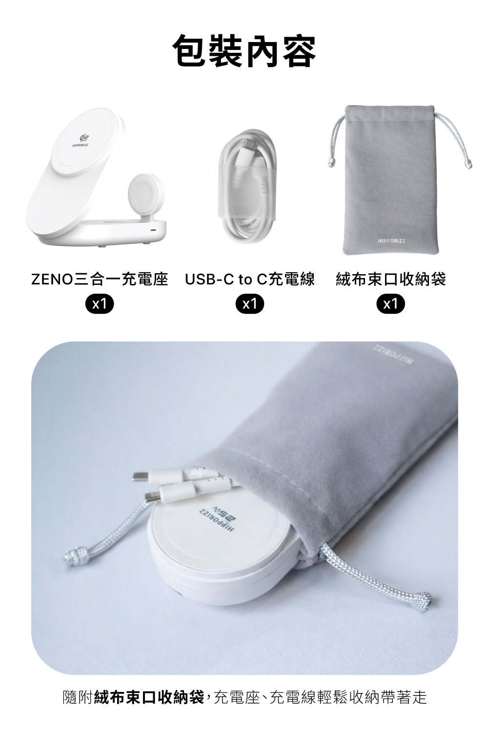 包裝內容物:ZENO三合一充電座*1, USB-C to C充電線*1, 絨布束口收納袋*1